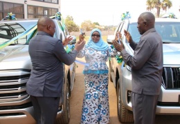 Mkuu wa Mkoa wa Katavi Mh. Mwanamvua Mrindoko akimkabidhi funguo wa gari Katibu Tawala Mkoa Albert G. Msovela kwa ajili ya matumizi ya ofisi na utoaji huduma kwa wananchi wa Katavi.