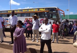 Watumishi wa Halmashauri ya Manispaa Mpanda na mawakala wa vyombo vya usafiri katika stand ya Mkoa ya Mizengo Pinda walipokuwa wakimsikiliza kwa makini Mkuu wa Mkoa wa Katavi, Mhe Juma Zuberi Ho...