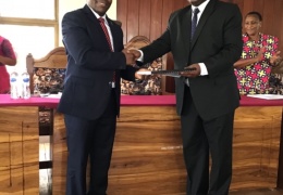 Mhe Juma Zuberi Homera akiwa katika picha ya pamoja na Mhe Mkuu wa Mkoa Mstaafu, Amos Gabriel Makalla na watumishi wa Sekretariati ya Mkoa wa Katavi katika hafla fupi ya makabidhiano ya Ofisi tarehe 2...